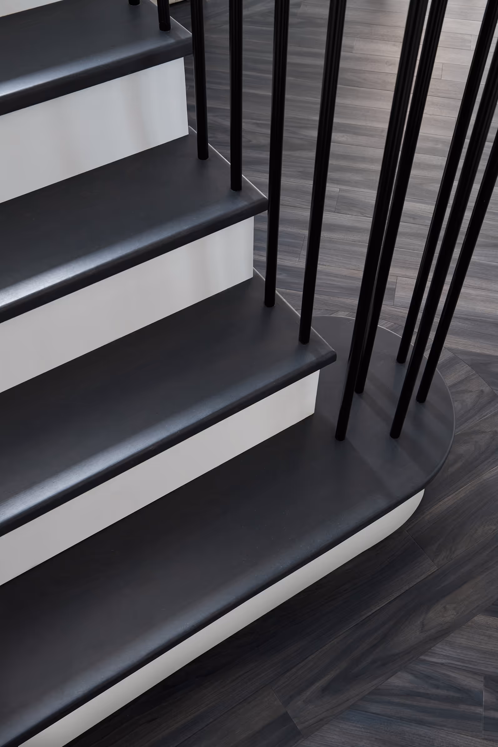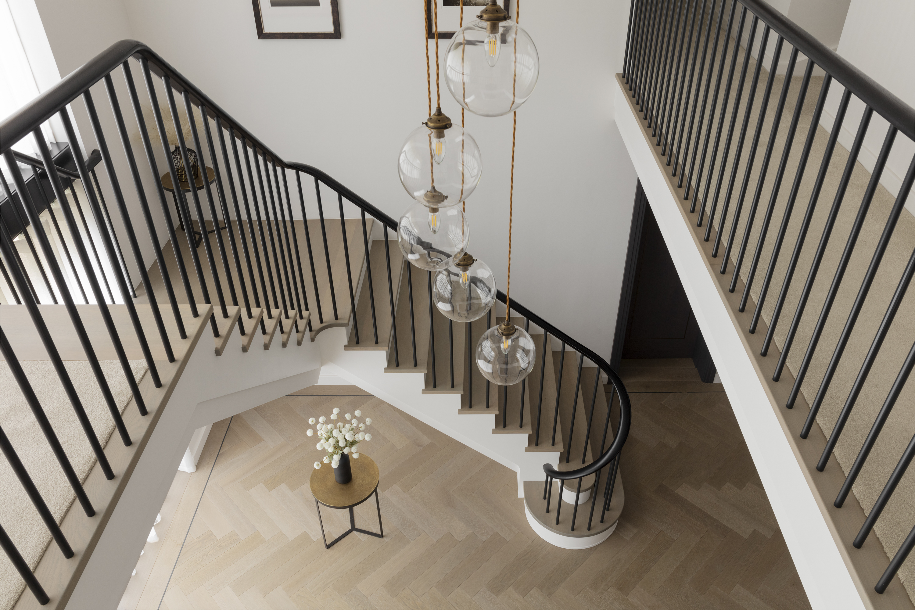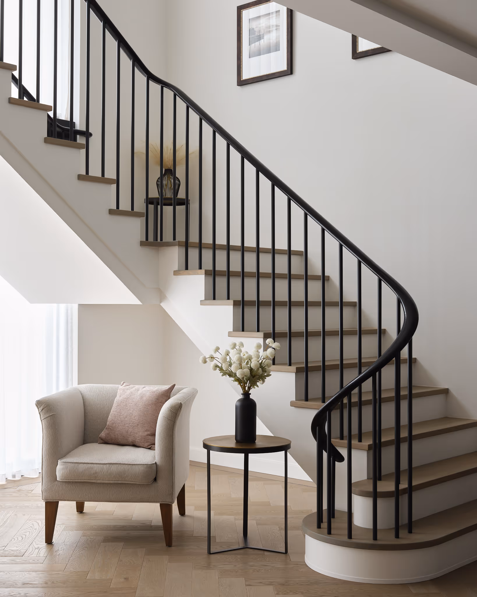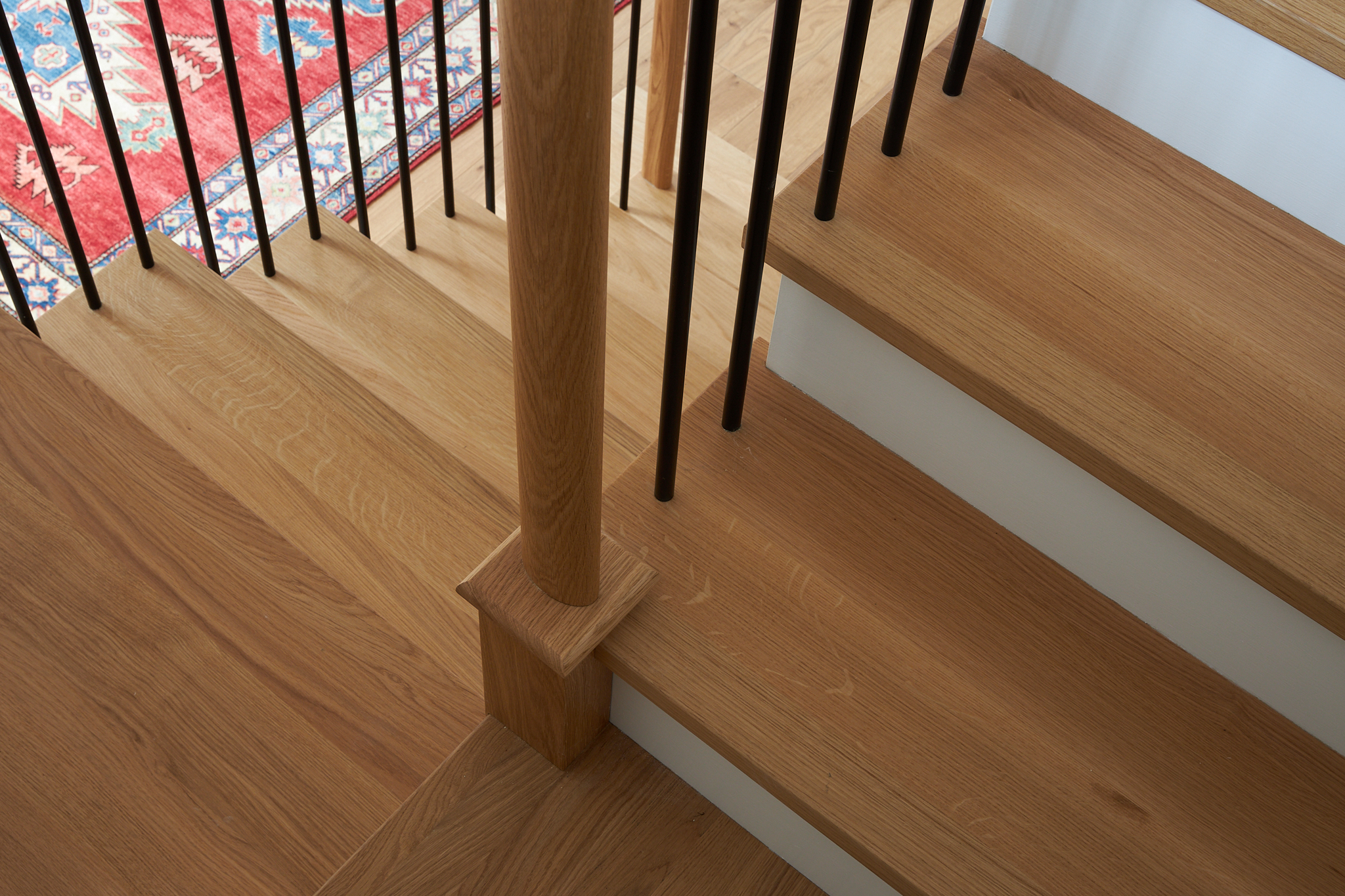 • Beautiful opportunities for contrasting finishes—such as white strings paired with natural oak treads or contrast rails against powder-coated spindles—for depth and character.
