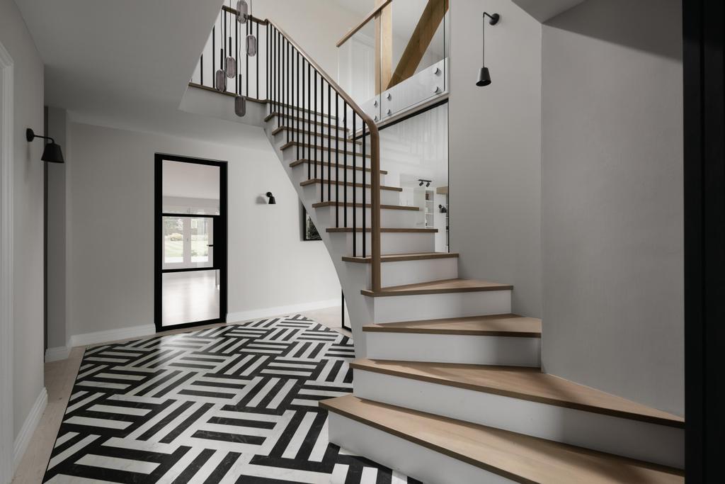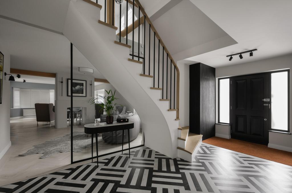 As part of a complete home renovation, we were tasked with designing a striking feature staircase within a small hallway that presented limitations in both space and headroom. The challenge was to deliver a true “wow factor” while remaining fully compliant with building regulations. By incorporating a custom twisting winder detail alongside a cut-string design, we were able to maximise the available space and create a visually impressive centrepiece that perfectly suits the compact setting.